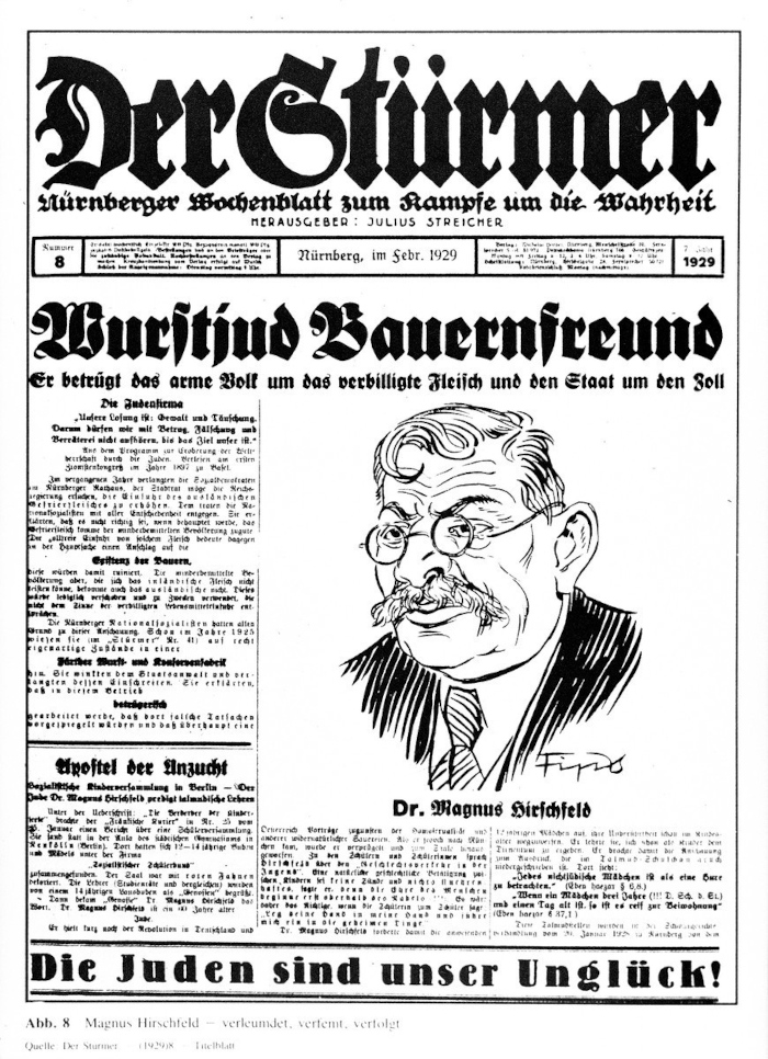 In February 1929, the Nazi newspaper "Der Stuermer" depicted a caricature of Magnus Hirschfeld. The Nazi Party attacked Dr. Hirschfeld for his ideas about sex, sexuality, and gender, as well as his Jewish ancestry.