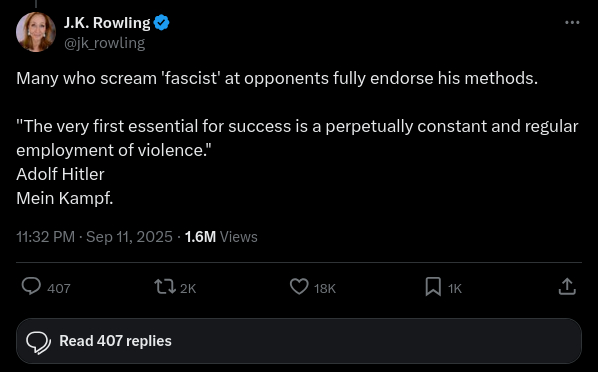 J.K. Rowling twice quoted Adolf Hitler’s book Mein Kampf in posts on X (formerly Twitter) once, during 11th September 2025 and the other on 17th September 2025.