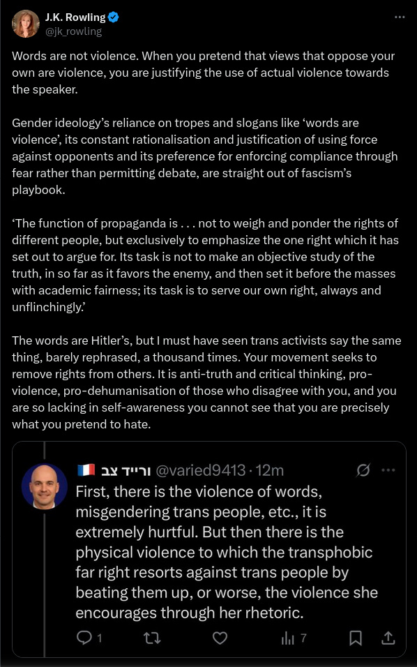 Rowling quoted Hitler again to describe the nature of propaganda, stating: "The function of propaganda is... not to weigh and ponder the rights of different people, but exclusively to emphasize the one right which it has set out to argue for". She claimed modern trans activists' rhetoric was "barely rephrased" from this ideology.