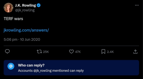 In episode five of the podcast The Witch Trials of J.K. Rowling, the author describes the trans rights movement as “dangerous.” Here’s an excerpt of her statement from March 2023: