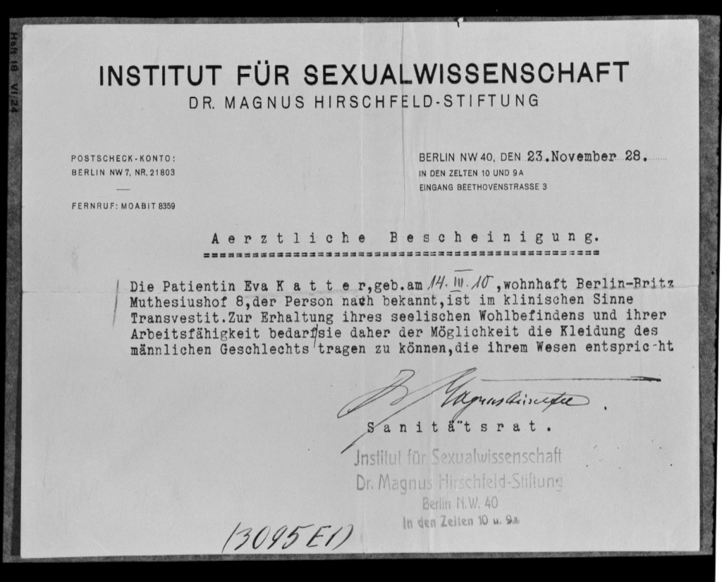 "the most interesting mankind. A complex sexual mankind. Dr. [Hirschfeld] was the best authority on this subject. In fact he discovered it. The behavior of transvertit helped to explain some of that of the homosexual, bisexual, and even heterosexual."